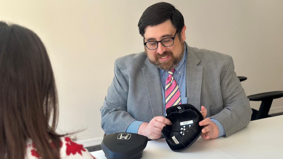 Craig Orlan, Government & Industry Relations, with with a counterfeit driver's airbag cover