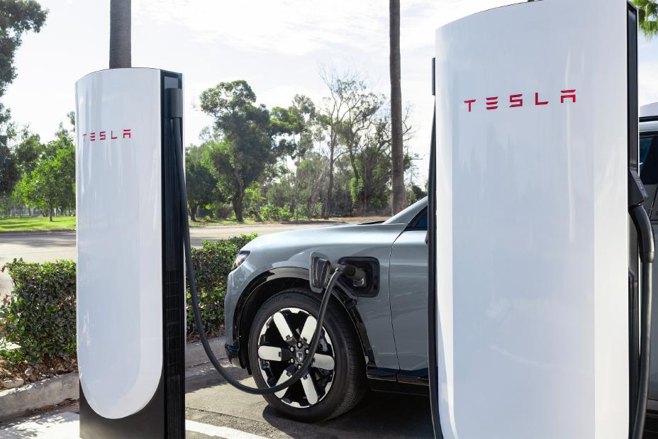 Honda Prologue EV utilizing the Honda-approved NACS-CCS adapter to charge at a Tesla Supercharger