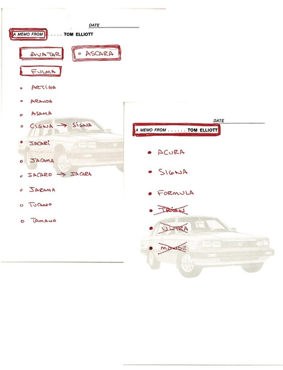 Tom Elliott, then assistant vice president of auto sales, was a key player in the development of Acura, including the naming of the brand. Here are Elliott’s notes from one of the meetings where brand names were discussed with NameLab, Inc., the San Francisco-based company hired to come up with a name that could embody the key concepts for the new brand – precision and quality. This resulted in “Acura” – derived from the Latin root “acu,” meaning sharp or precise.