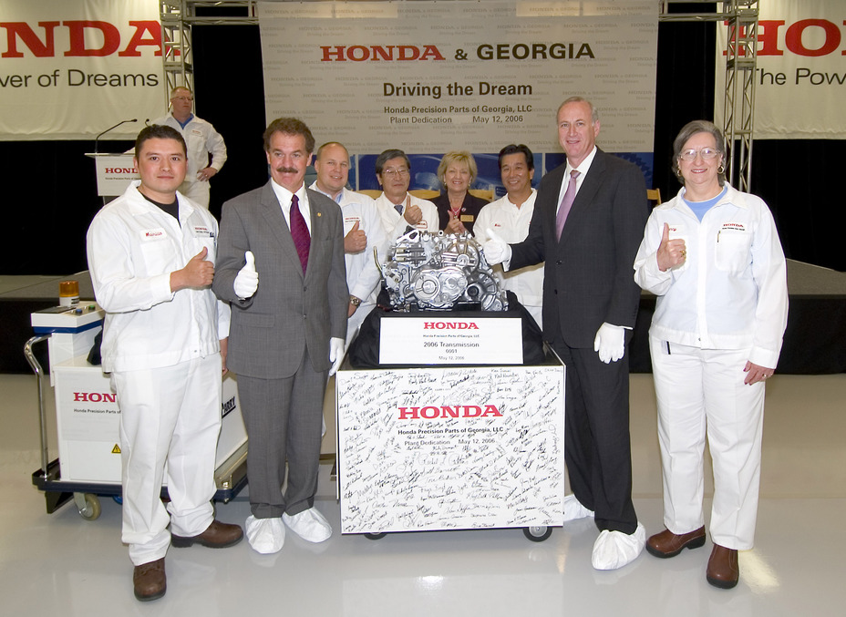Tallapoosa, Ga. - Honda Precision Parts of Georgia, LLC (HPPG), together with Georgia state and local officials, today celebrated the start of mass production of five-speed transmissions at its West Georgia facility in Haralson County. At the plant dedication ceremony, the company announced plans to expand production capabilities - increasing its original $100 million investment to $150 million as well as an increase in its employee base from 400 associates to 440 associates. The company also announced plans for expansion of the factory's footprint from 250,000 square feet to 350,000 square feet. From left: Mauricio Taburo, HPPG Associate, Representative Phil Gingrey, John Spoltman, Vice President, HPPG, Koki Hirashima, Honda Motor Company Global , Manufacturing Leader, Jacquelin Roberts, Mayor Pro Tem of Tallapoosa, Nobu Sanui, President, HPPG, Craig Lesser, Commissioner of the Georgia Department of Economic Development, Nancy Crosby, HPPG Associate.