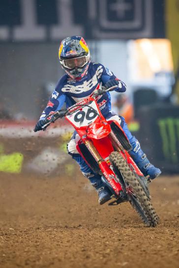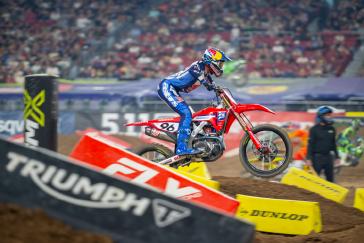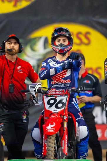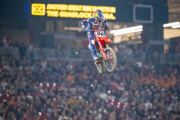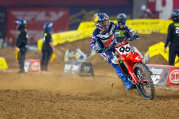 The 450SX main event saw the Honda HRC Progressive rider launch from the gate in third, but he wasted no time charging forward, taking over the lead on the opening lap. Lawrence set the pace for several laps before being overtaken by Ken Roczen, at which point he settled into a consistent rhythm and maintained a comfortable gap over third place. A signature late-race surge wasn’t enough for the Australian to reach Roczen, and Lawrence crossed the checkered flag in second place.