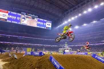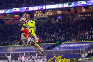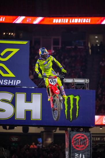 The first 450SX race saw Lawrence start inside the top five and make his way to third before a small mistake relegated him to an eventual seventh-place finish. After regrouping during the short turnaround, he executed another strong start, getting around Jason Anderson in the first turn to take over second position. As he had done in the previous rounds, Lawrence gained strength lap by lap; he made a decisive pass on Jorge Prado to take the lead and never looked back until the checkered flag, earning his first win in an individual 450SX Triple Crown race. The final race of the evening got underway with Lawrence in second position. For the first half of the race, he faced challenges from Tomac and Anderson and briefly dropped to third before regaining second position. With Lawrence provisionally tied on race points with Cooper Webb in the late going, the overall victory was ultimately decided behind him, as Webb made a late pass to secure the overall victory. Lawrence's 7-1-2 tally earned him second overall.