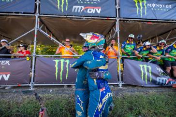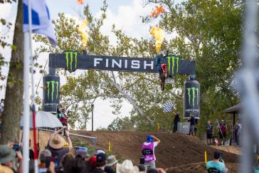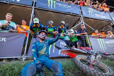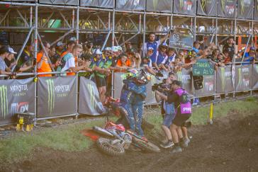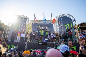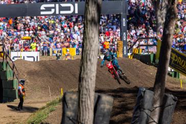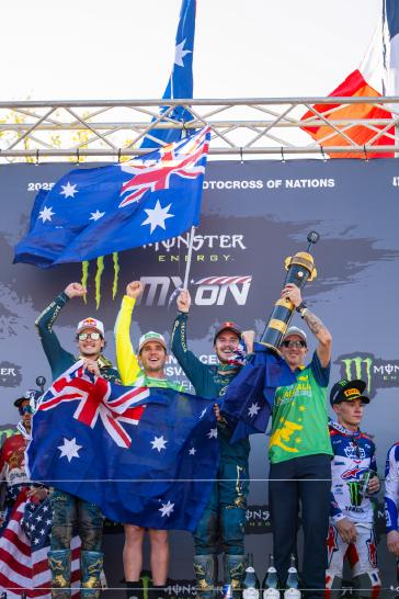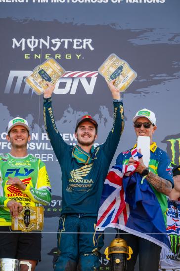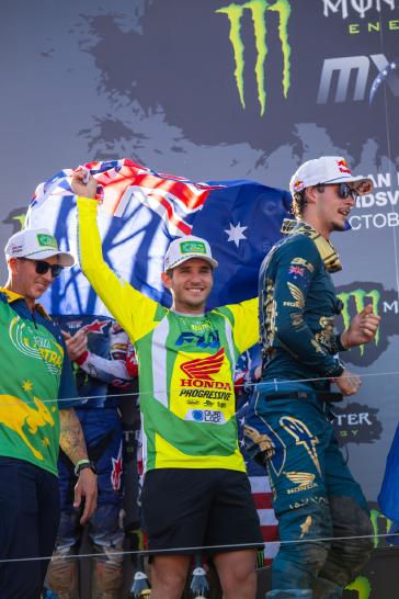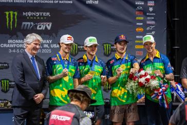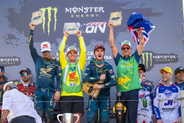 The Motocross of Nations format features three motos, each of which includes two classes. Jett set the pace early by winning the opening moto and backing it up with a third-place finish in moto 3, earning individual MXGP honors and helping secure the overall win for Team Australia. Hunter dominated the Open class with a perfect 1-1 score despite a couple of tip-overs, solidifying Australia's championship effort. Webster overcame a pair of first-turn pileups to charge from the back in both of his motos, tallying 15-13 results for fifth overall in the MX2 category. With the Lawrences taking all three moto wins between them (and each team's worst result thrown out), Australia's 19-point total was comfortably ahead of runner-up Team USA's 33-point score.